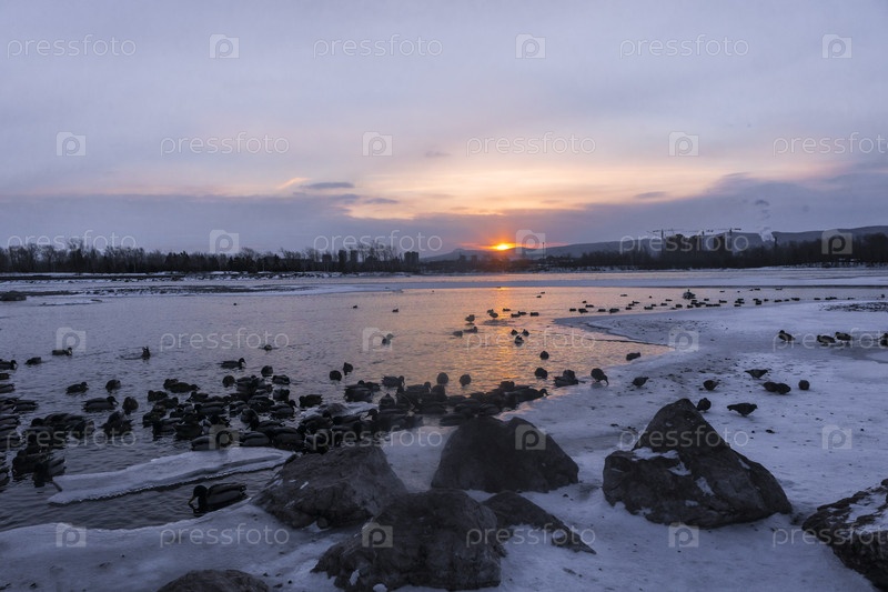 Раннее зимнее морозное утро над Енисеем в центре Красноярска