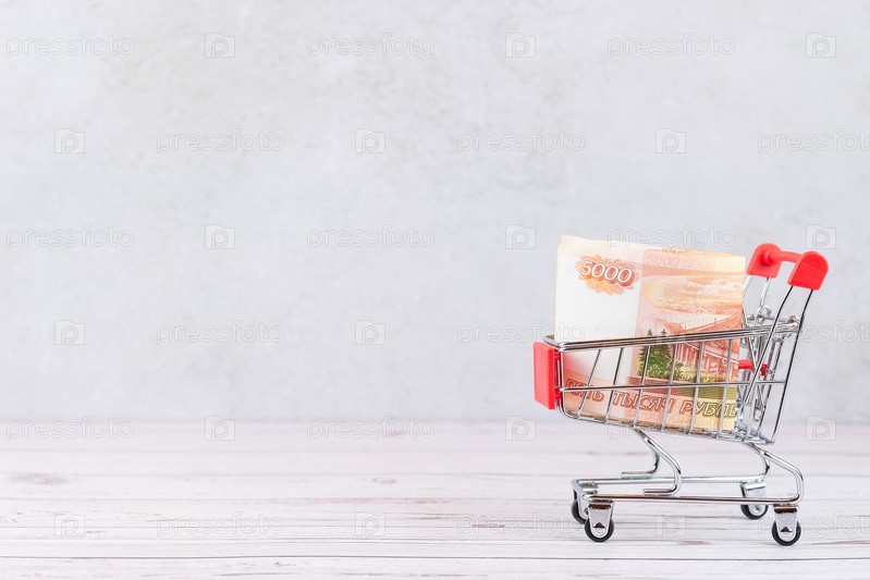 Корзина с российскими рублями внутри
