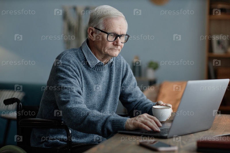 Пожилой мужчина-пользователь инвалидной коляски печатает на ноутбуке, выпивая чай дома