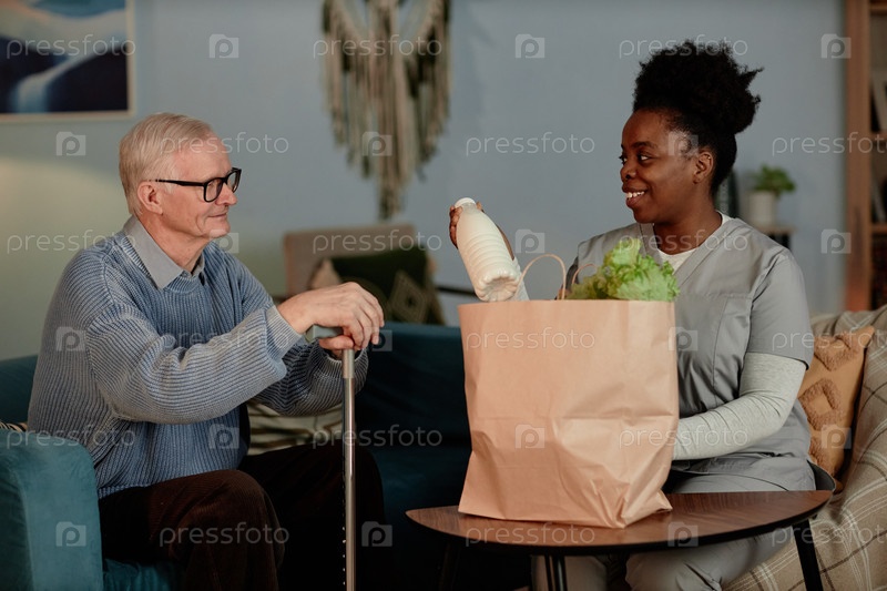 Улыбающаяся чернокожая социальная работница помогает пожилому человеку с продуктом, доставляет еду в помещении