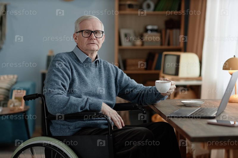 Портрет старшего мужского пользователя инвалидной коляски, держащего чашку чая за столом с ноутбуком дома
