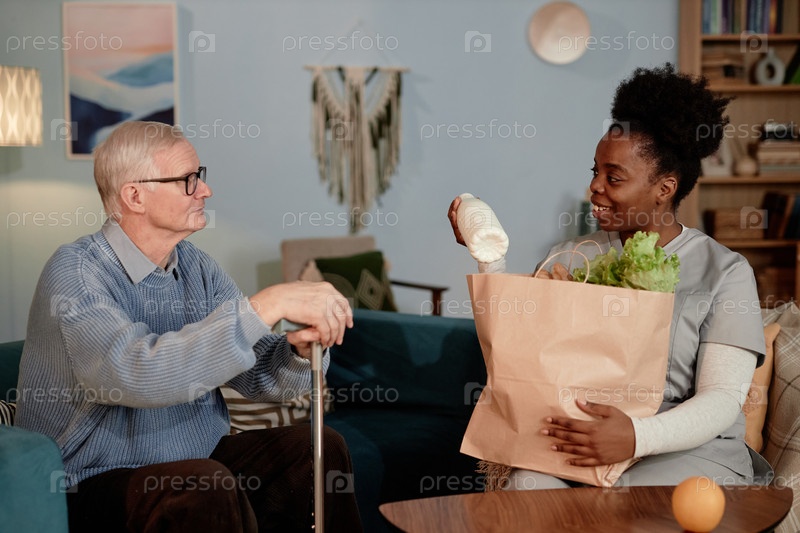 Улыбающаяся чернокожая женщина-попечительница помогает пожилому человеку доставлять еду домой