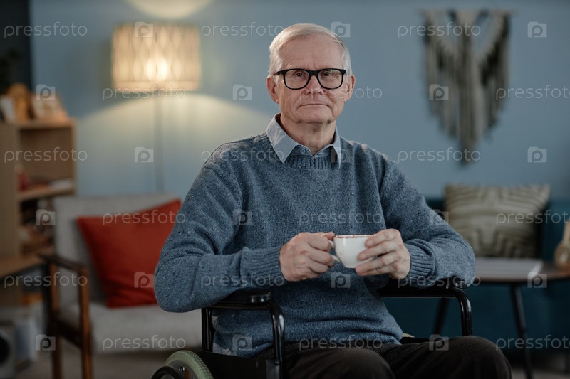 Портрет пожилого человека в инвалидном кресле, носящего синий свитер и очки, позирующего дома