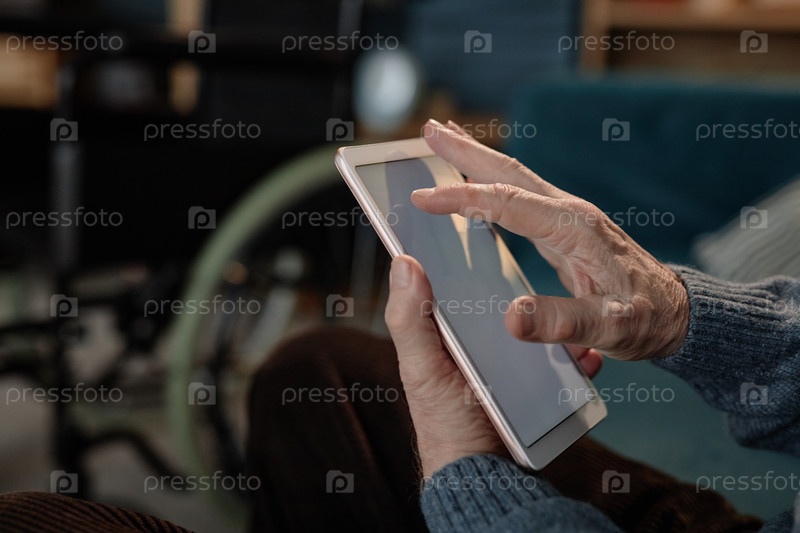 Руки пожилого человека, прикасающегося к экрану цифрового планшета с помощью устройства дома