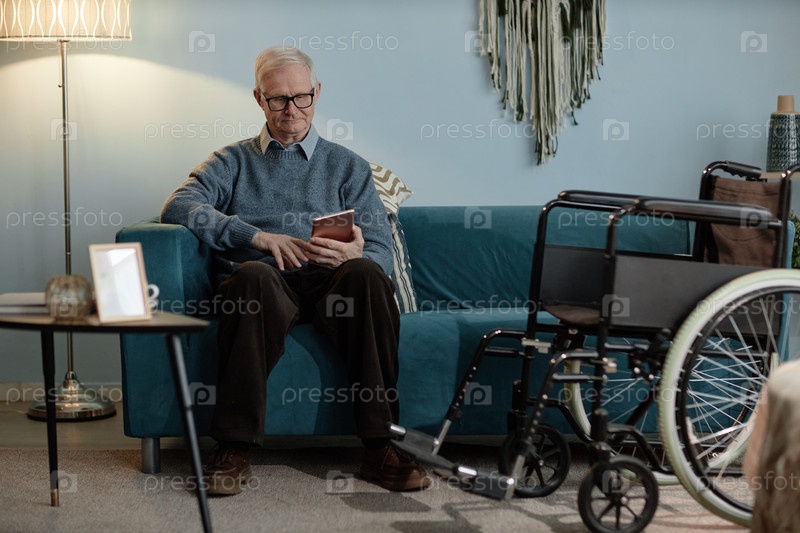 Пожилой пользователь инвалидной коляски сидит на диване, печатает на цифровом планшете дома