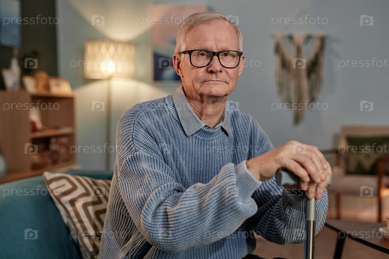 Портрет пожилого человека в очках, сидящего одного на диване с ходовой тростью дома