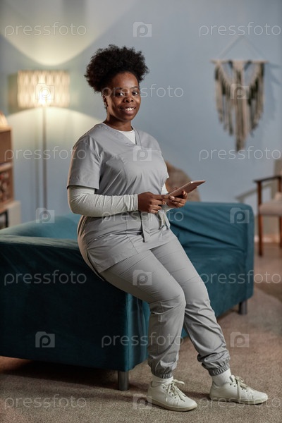 Портрет позитивной чернокожей женщины-попечителя с цифровым планшетом, посещающей дом пациентов