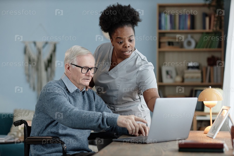 Женщина-социальный работник помогает пожилому мужчине, пользующемуся инвалидной коляской с ноутбуком в черном цвете