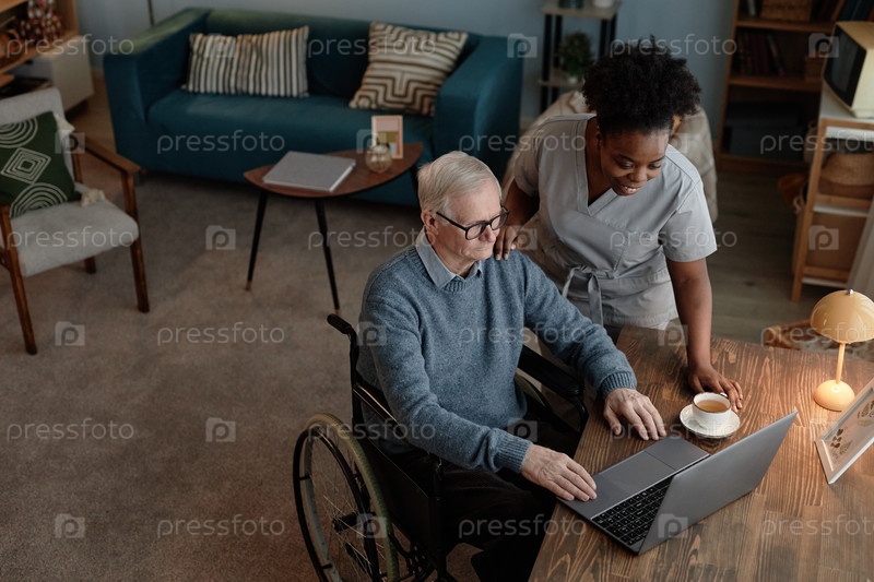 Чернокожая социальная работница помогает пожилому человеку на инвалидном кресле с компьютером в помещении