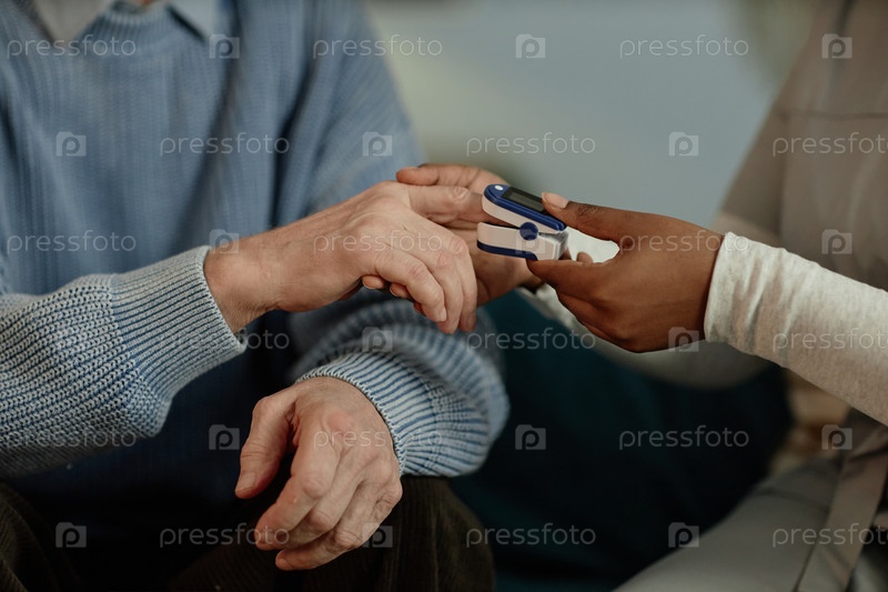 Чернокожая женщина-опекун, использующая оксиметр для тестирования пожилых мужчин Кровная насыщенность кислородом в доме