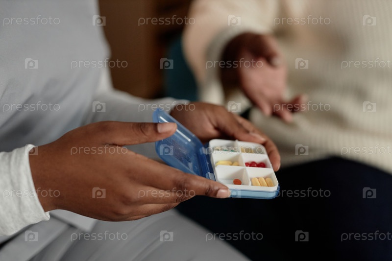 Медсестра-женщина, держащая коробку с таблетками Организатор с лекарствами во время посещения пациента дома