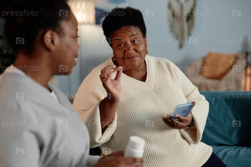 Старшая чернокожая женщина консультируется с женщиной-социальным работником о рецептурных таблетках во время домашнего посещения