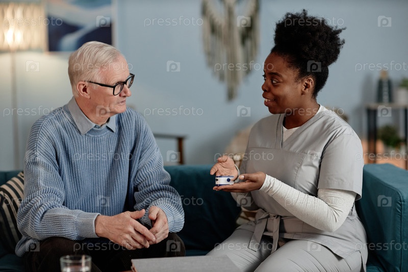 Улыбающаяся чернокожая женщина-опекун с оксиметром посещает пожилого человека для медицинского осмотра дома