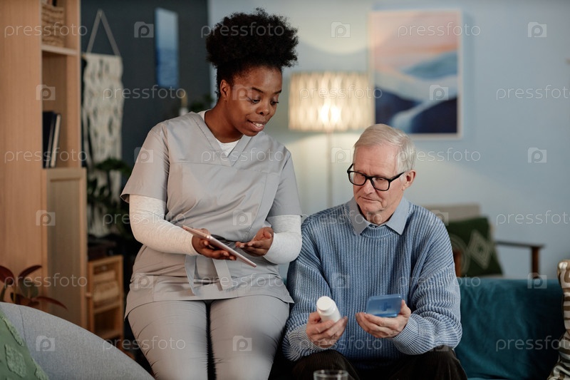 Чернокожая медсестра разговаривает со старшим мужчиной, помогая с рецептурными таблетками во время домашнего посещения