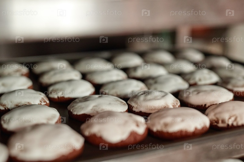 Хлебные булочки с белым льдом охлаждаются на подносе, пока свеже выпечены в кондитерской