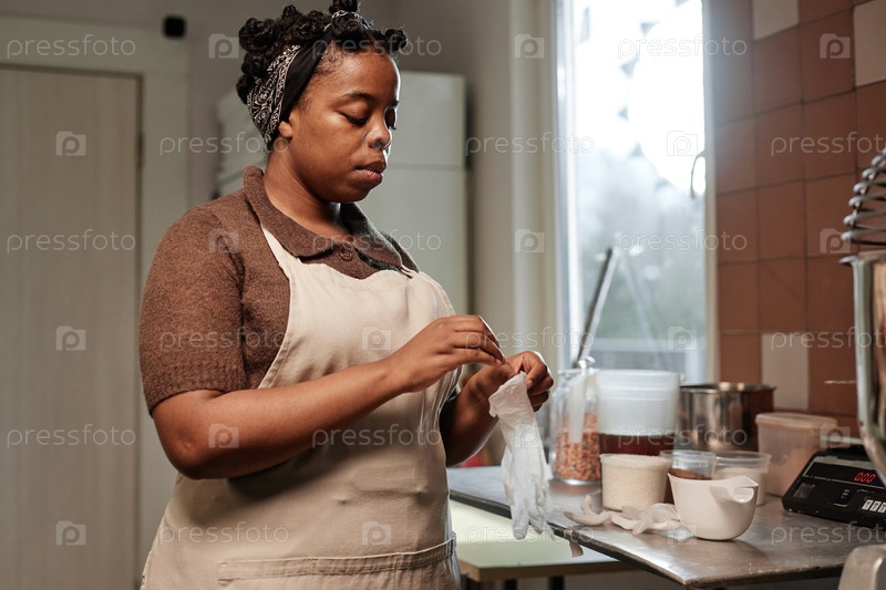 Черная женщина-пекарня в фартуке надевает виниловые перчатки готовится к приготовлению пищи на пекарной кухне