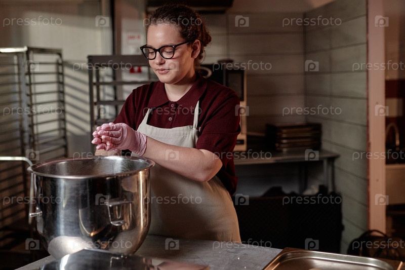 Молодая пекарня формирует тесто, делая печенье на рабочей станции в помещении