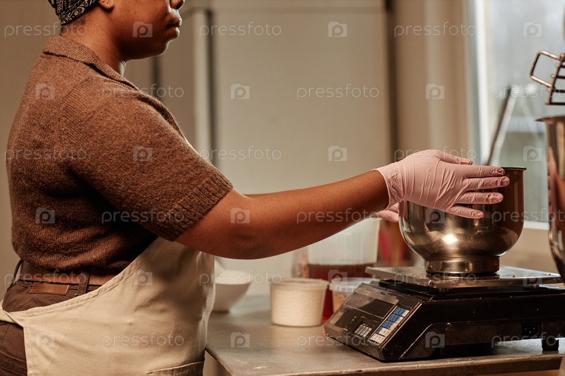 Черная женщина-пекарня в перчатках, измеряющая ингредиенты на весах в кондитерской кухне