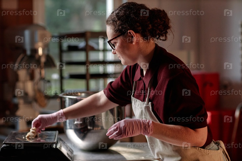 Молодая женщина, расширяющая тесто Пекарные булочки на кухне пекарни