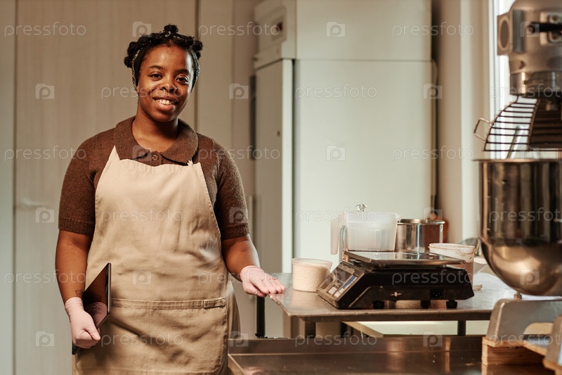 Портрет улыбающейся чернокожей пекарни с планшетом, стоящей за рабочим столом на кухне