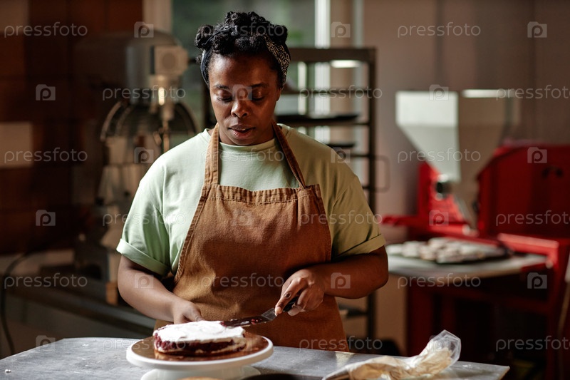 Чёрная женская кондитерская шеф-поварка, укладывающая торт с кремом на пекарской кухне