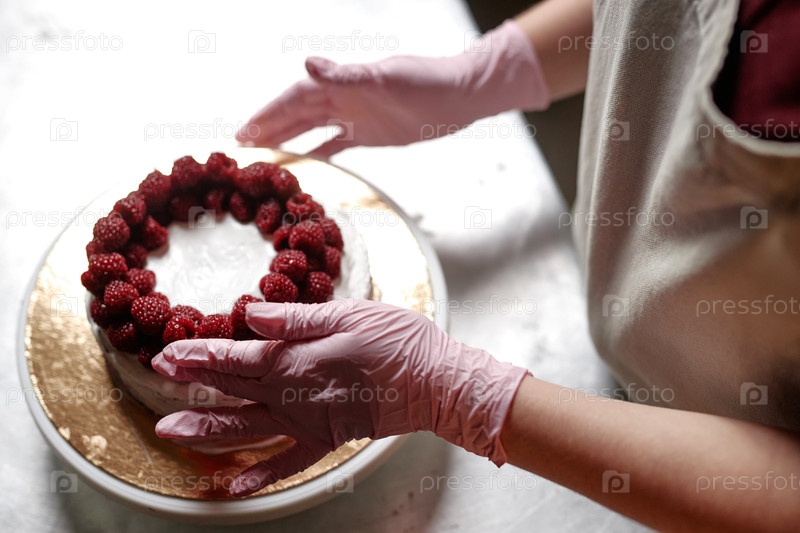 Повар-женщина украшает торт с малиной на кухне кондитерской