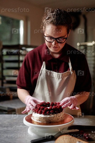 Женский шеф-повар украшает торт с малиной на кухне кондитерского магазина