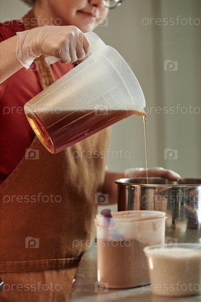 Женщина в перчатках наливает сладкий сироп из чашки в миску, смешивая ингредиенты для хлеба внутри