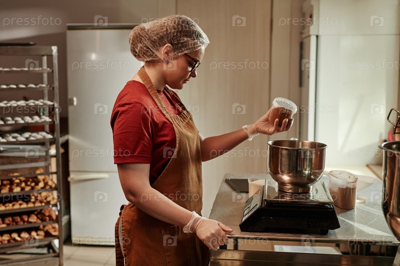 Молодая Женщина Пекарь Скалирование Ингредиенты смешивания какао-порошка для муки в помещении