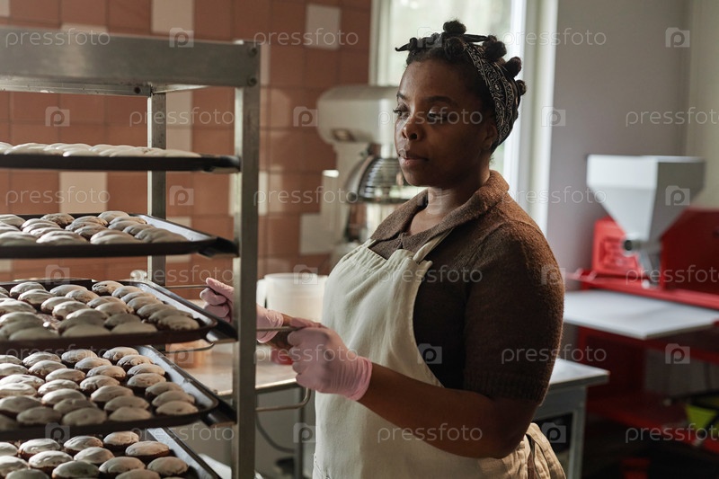 Портрет чернокожая женщина-пекарня в фартуке перемещающая стойку с булочками на кухне пекарни