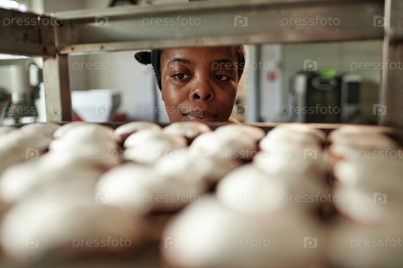 Портрет чернокожей женщины, проверяющей глазированные булочки на подносах Выпечка пирожных в кухне