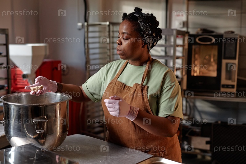 Черная взрослая женщина формирует тесто, делает печенье на рабочем столе в помещении