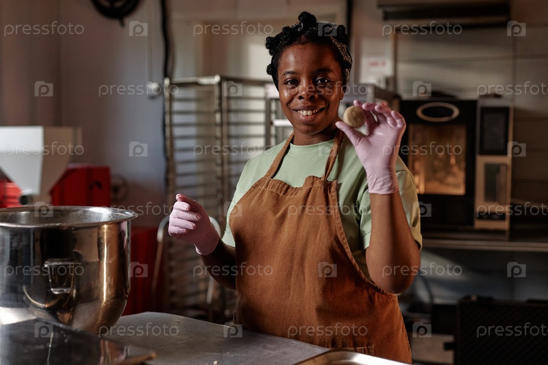 Портрет улыбающегося чёрного женщины пекаря, держащего круглый кусок теста, делая выпечку в помещении