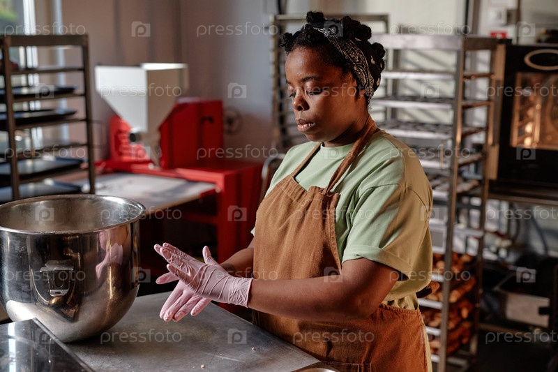 Взрослая черная женщина пекарня, круглящая тесто, делающая печенье на кухне хлебобулочной