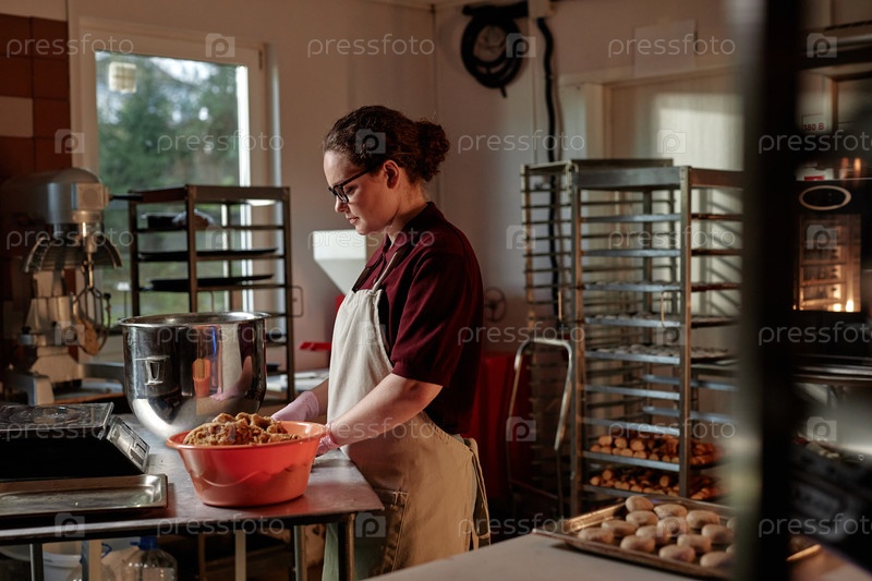 Молодая пекарня готовит тесто на рабочем столе Делает хлеб в коммерческой кухне