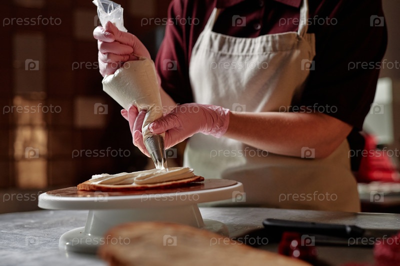 Руки женского кондитерского шеф-повара, укладывающего отбивный крем с трубопроводной сумкой, украшающей торт в помещении