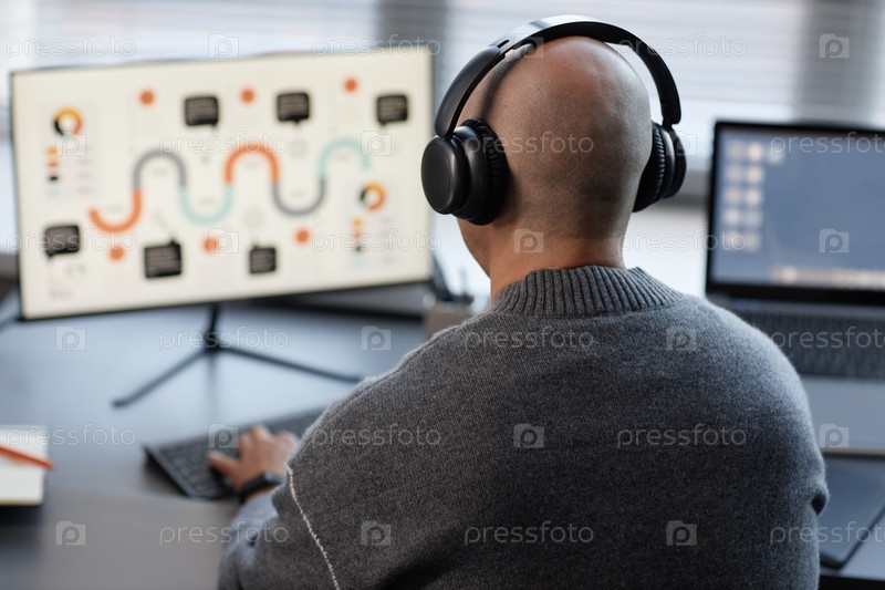 лысый мужской корпоративный работник, носящий наушники во время печатания на компьютере в офисе