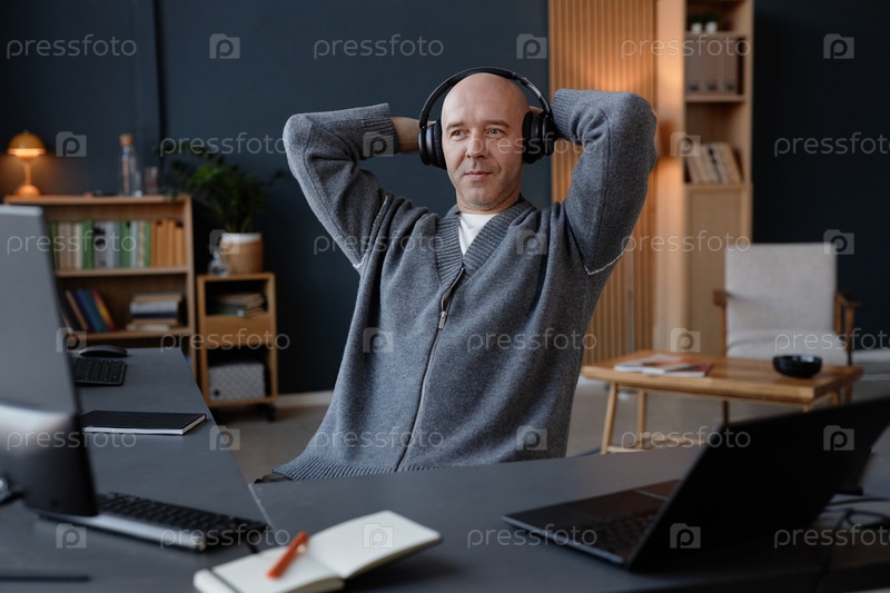 Расслабленный лысый мужчина среднего возраста в наушниках сидит за столом с компьютером на рабочем месте