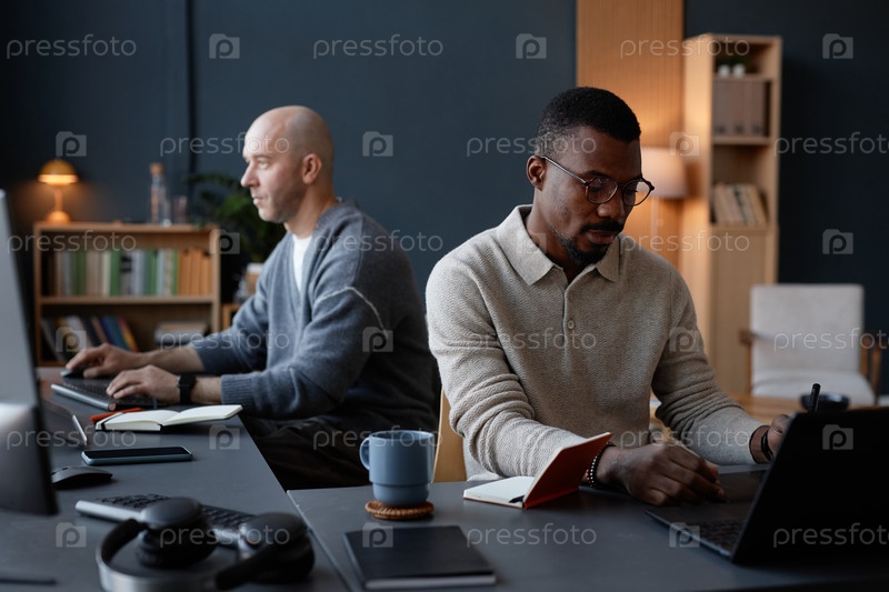 Разнообразная команда дизайнеров, работающих над графическим проектом с использованием компьютеров за столом в офисе