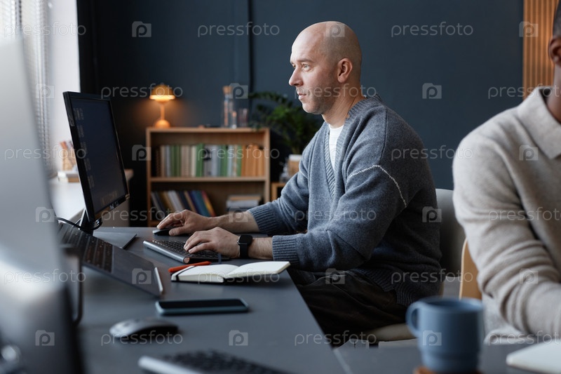 Зрелый лысый мужчина печатает на клавиатуре настольного компьютера, работая за столом в офисе