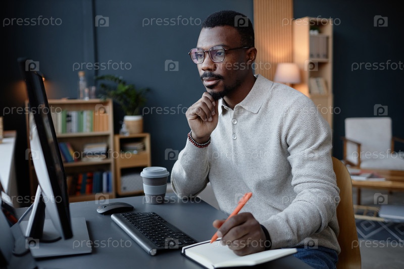 Сосредоточенный чернокожий человек, использующий компьютер во время записи в блокноте на рабочей станции в офисе