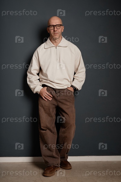 Лысый мужчина, носящий пуловер и джинсы, позирующий на серой стене в студии Mature