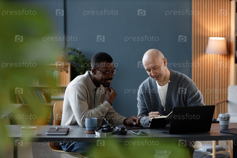 лысый мужской дизайнер разговаривает с улыбающимся черным коллегой, работая вместе за столом в офисе
