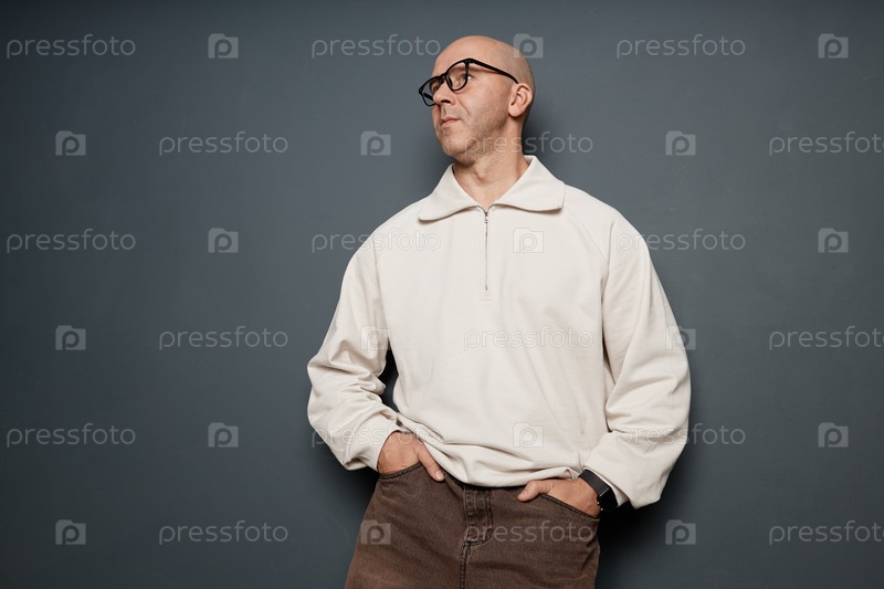 Зрелый лысый мужчина, носящий белый жип-пуловер, позирует на серой стене в студии