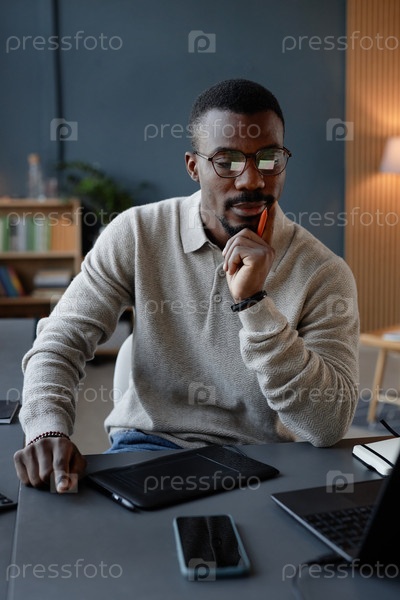 Фокусированный чернокожий мужской дизайнер с очками, использующий ноутбук за рабочим столом в корпоративном офисе