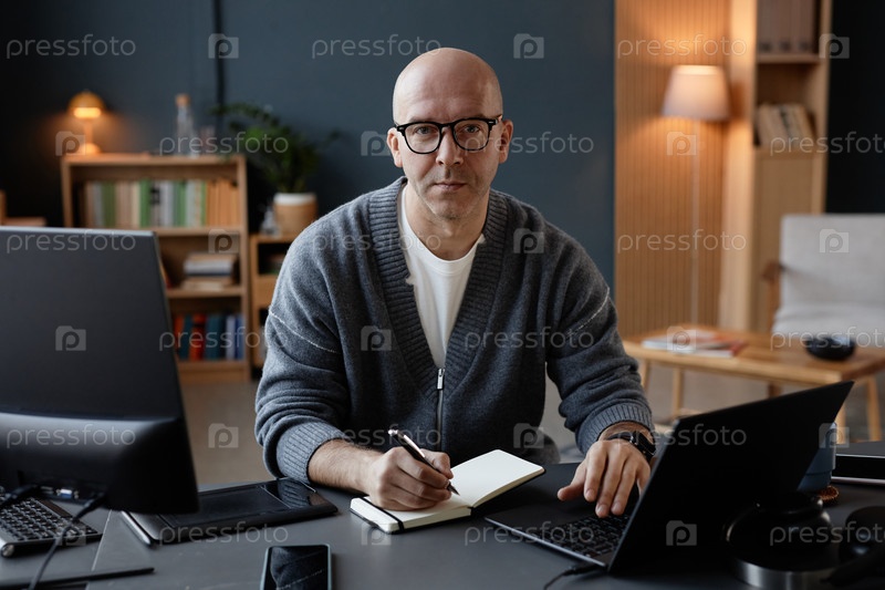Портрет лысого зрелого мужчины, пишущего в блокноте Работающий онлайн на ноутбуке в офисе