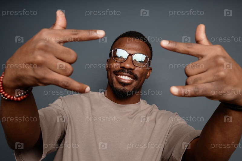 Портрет улыбающегося лысого мужчины с очками, показывающий признаки рогов в студии