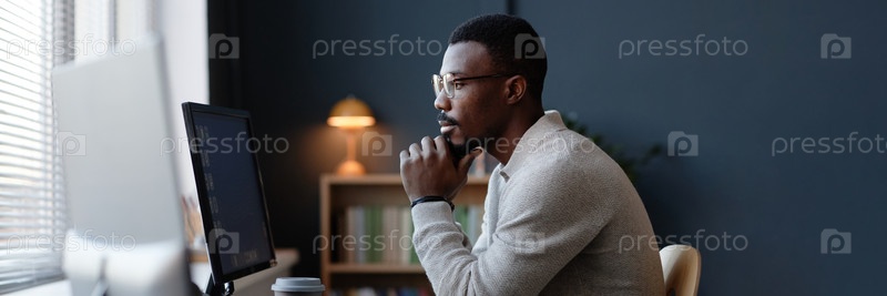 Заголовок изображения чернокожего человека, использующего компьютер во время работы за столом в домашнем офисе