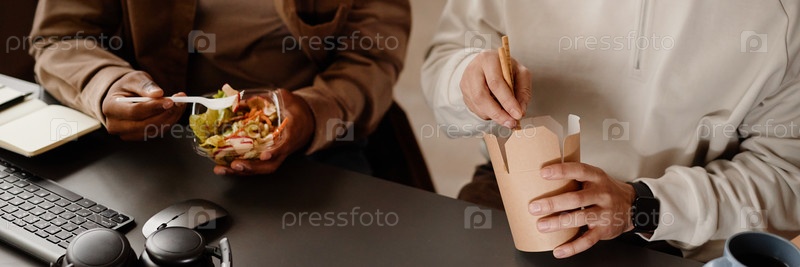 Header Image of Man Eating Noodles Having Lunch next to Colleague at Office Desk Человек ест лапшу, обедая рядом с коллегой на рабочем столе