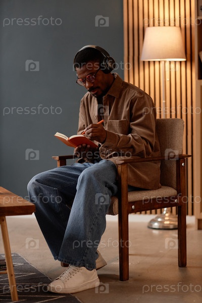 Чернокожий мужчина с наушниками пишет в блокноте, сидя на кресле в домашнем офисе